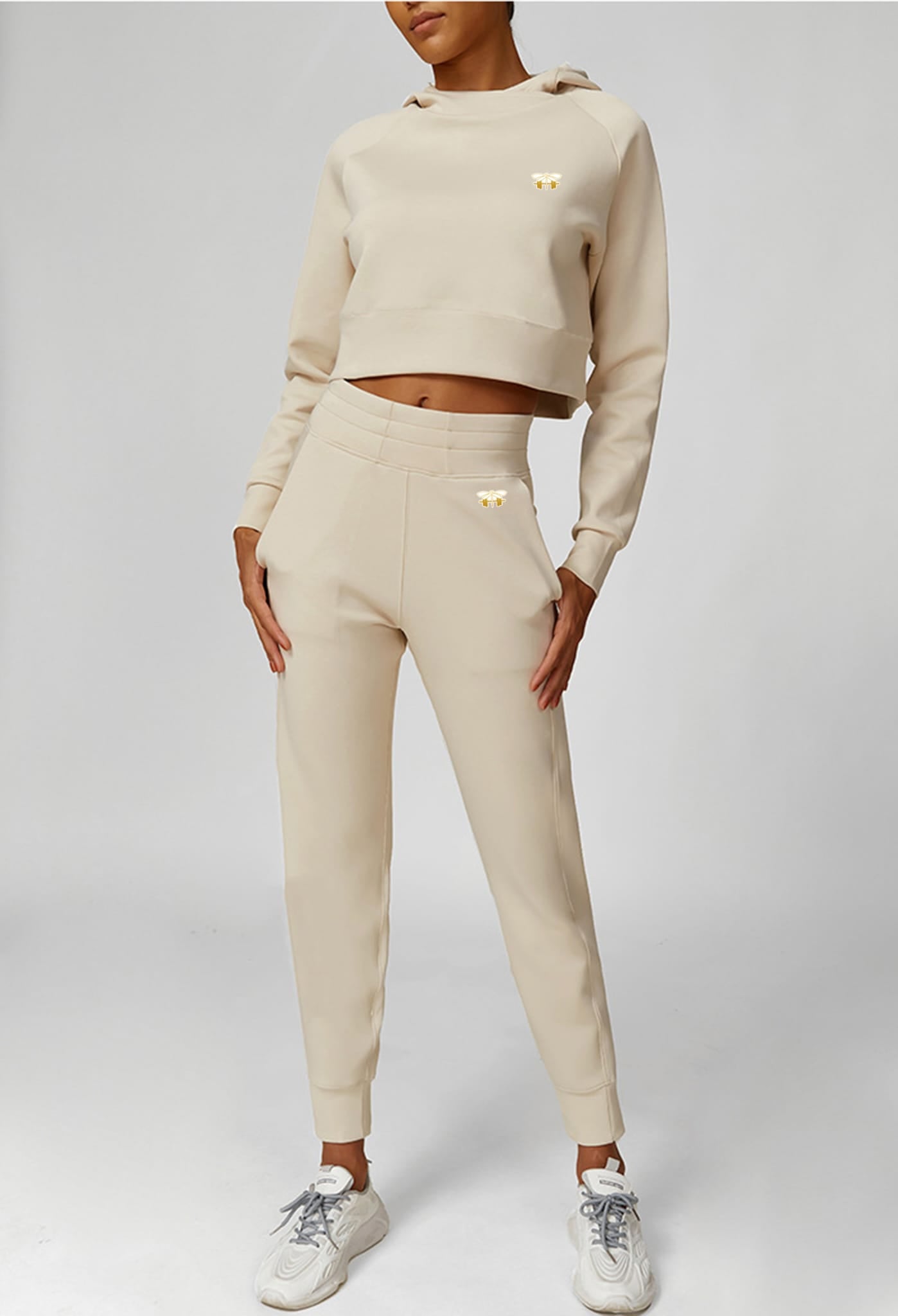 Beige Two Piece Tracksuit Set Long Sleeve Cropped Hoodie with Jogger